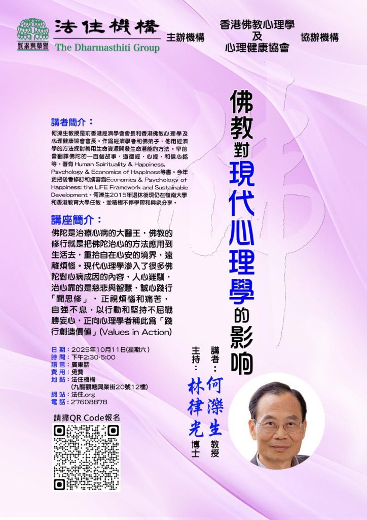 何濼生教授是前香港經濟學會會長和香港佛教心理學及心理健康協會會長。作為經濟學者和佛弟子,他用經濟學的方法探討善用生命資源開發生命潛能的方法。早前曾翻譯佛陀的一百個故事、道德經、心經,和信心銘等。著有 Human Spirituality & Happiness, Psychology & Economics of Happiness等書。今年更把後者修訂和擴容爲Economics & Psychology of Happiness:the LIFE Framework and Sustainable Development。何濼生2015年退休後現仍在嶺南大學和香港教育大學任教,並積極不停學習和與眾分享。