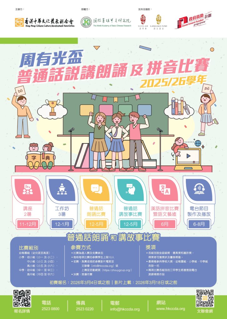 香港中華文化發展聯合會(本會)主辦語文教育及研究常務委員會(語常會)支持及語文基金撥款的周有光盃——普通話說講朗誦及拼音比賽》(Zhou Youguang Cup: Putonghua Speech, Storytelling and Pinyin Competition)(2025/26學年),主要涵蓋以下活動,包括: