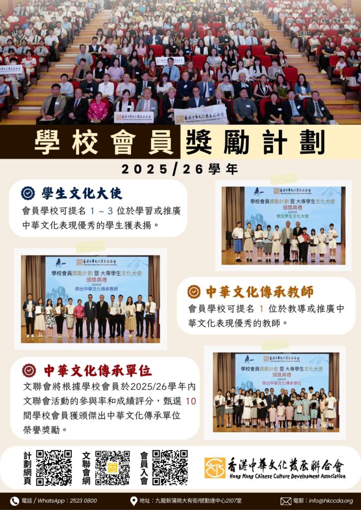 • 1. 文聯會將根據學校會員於2025/26學年內參加各文聯會活動的參與率和成績評分,甄選十間學校會員獲頒「傑出中華文化傳承單位」榮譽獎勵;