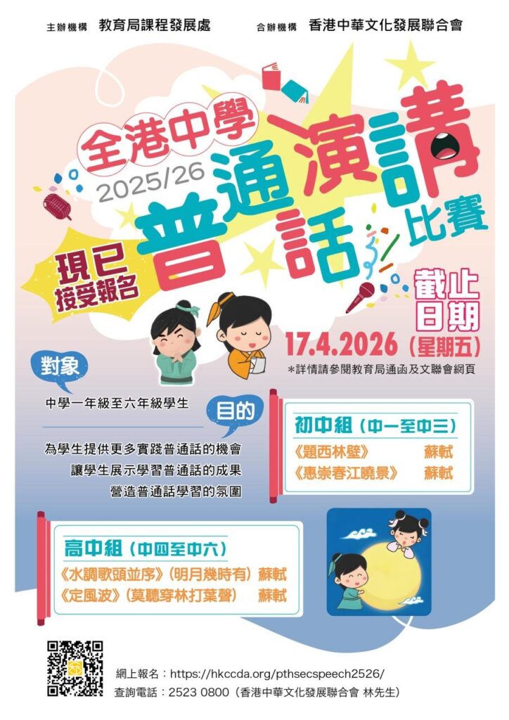 《2025/26全港中學普通話演講比賽》教育局課程發展處主辦, 香港中華文化發展聯合會(本會)合辦,目的是為學生提供更多實踐普通話的機會,讓學生展示學習普通話的成果,營造普通話學習的氛圍。